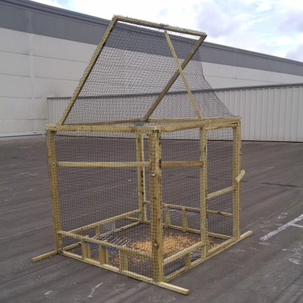 - This pigeon trap is sited on a roof and is shown with the lift-up roof up.