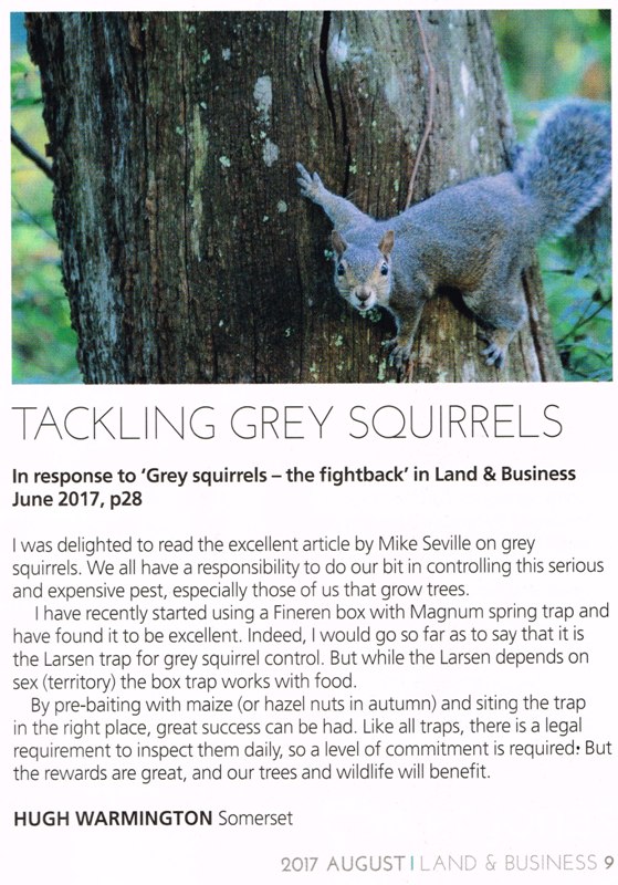 We brought 30 BMI Bodygrip traps and Fineren ply boxes from John, which turned up ready to go straight to work. Within days we were catching squirrels in them, I am suitably pleased with the traps clean killing ability, but the Fineren box is a cracking design as it very rarely has any evidence that it has a dead squirrel in it, to the untrained eye it must look like a bird box. You can also look from the truck at a rideside to see if the Trap has been sprung thus saving time on checking your traps. The build quality is high and the boxes are lasting well over the years with coats of preservative each year.